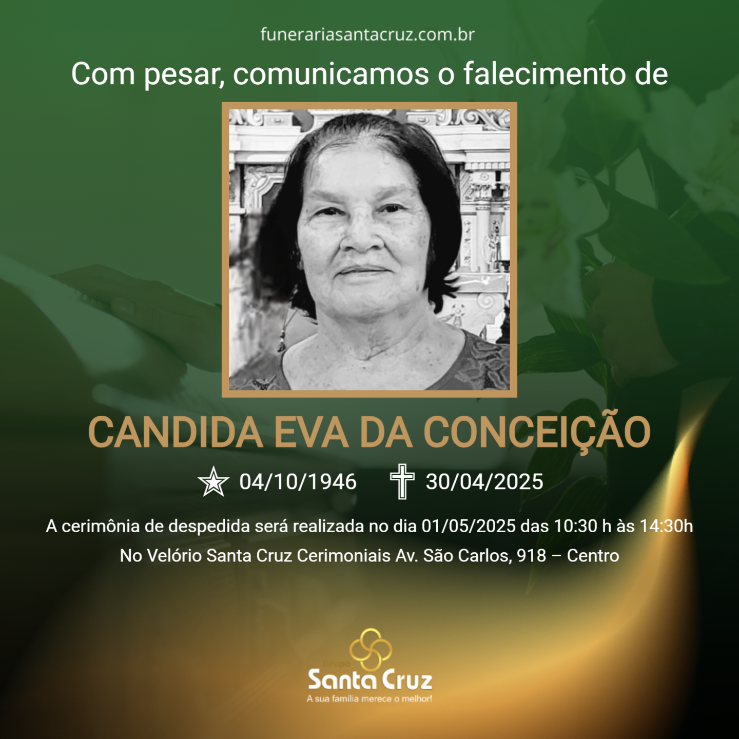 O Grupo Santa Cruz informou o falecimento de Cândida Eva da Conceição.