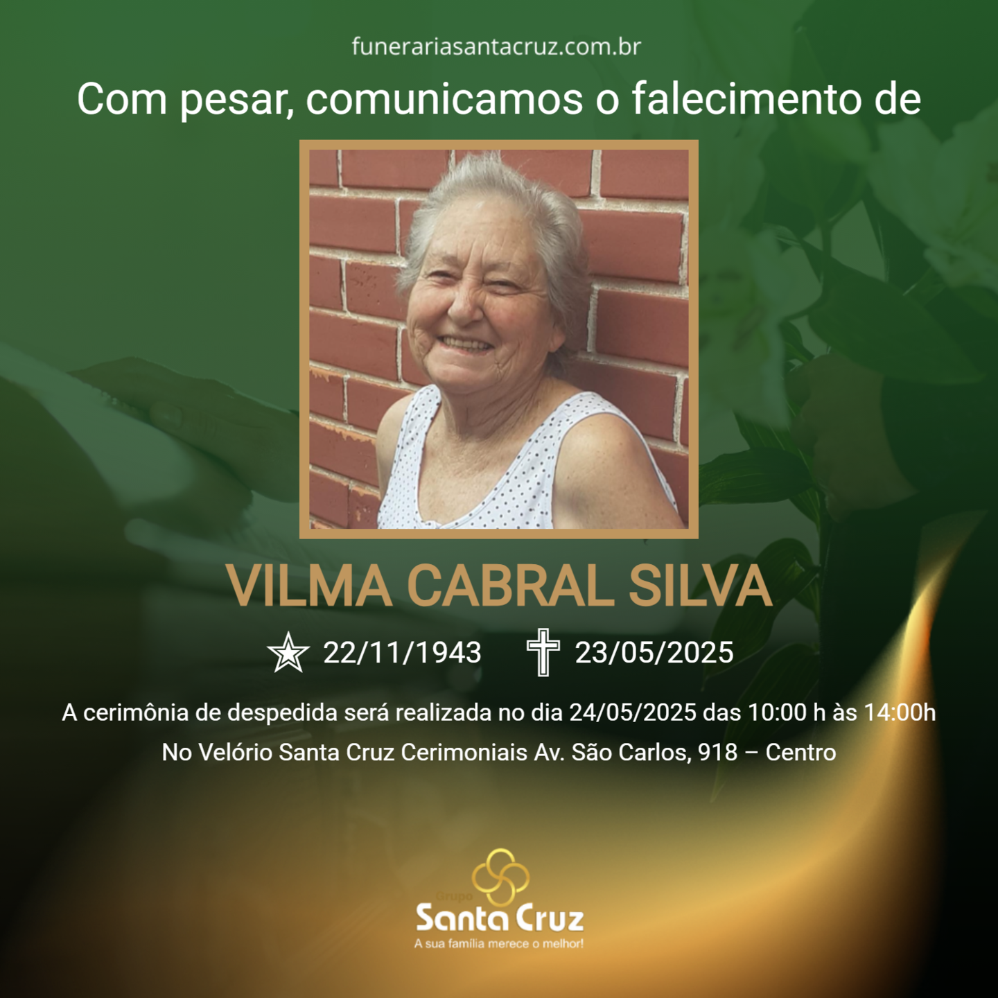 É com grande pesar que o Grupo Santa Cruz informa o falecimento da Sra. Vilma Cabral Silva, aos 81 anos de idade, ocorrido no dia 23/05/2025, na cidade de São Carlos.