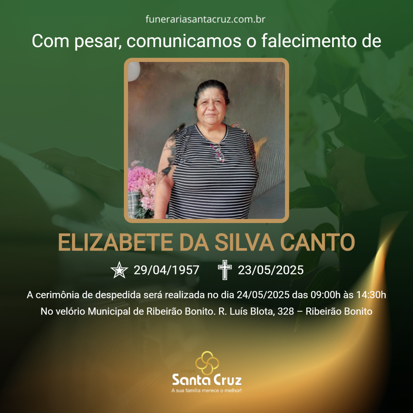O Grupo Santa Cruz informou o falecimento da Sra. Elizabete da Silva Canto.