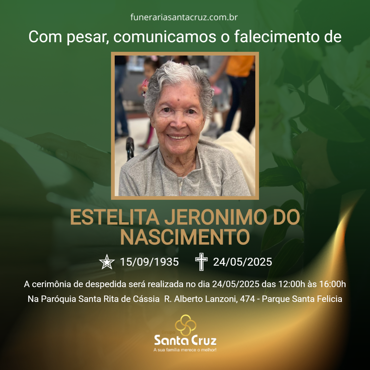 O Grupo Santa Cruz informou o falecimento da Sra. Estelita Jeronimo do Nascimento.