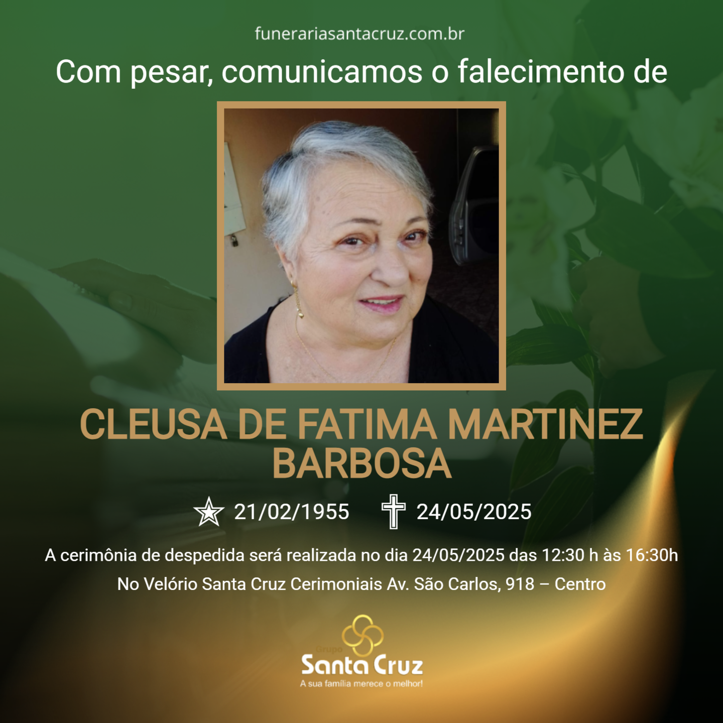 É com grande pesar que o Grupo Santa Cruz informa o falecimento da Sra. Cleusa de Fatima Martinez Barbosa, aos 70 anos de idade, ocorrido no dia 23/05/2025, na cidade de São Carlos.