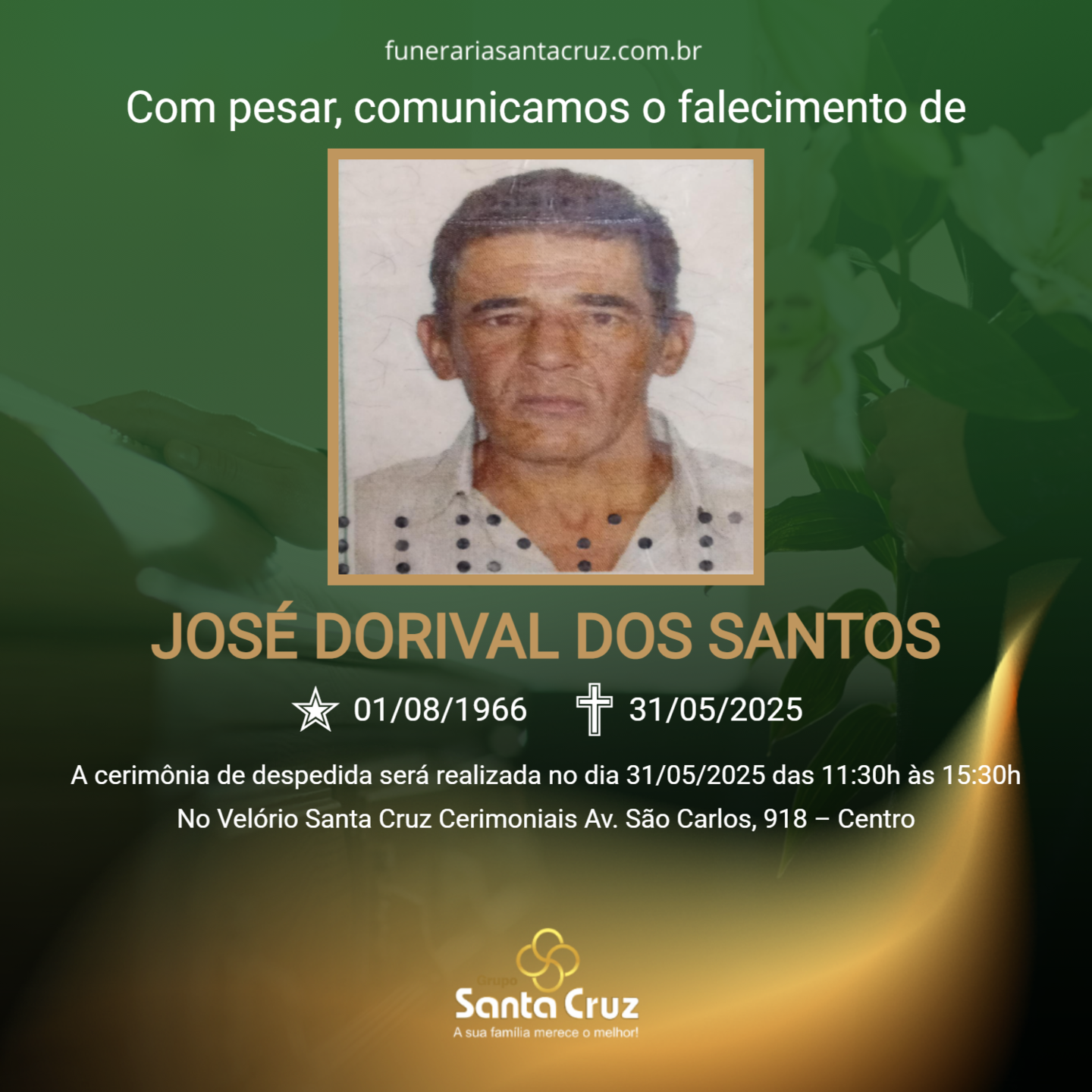 É com grande pesar que o Grupo Santa Cruz informa o falecimento do Sr. José Dorival dos Santos , aos 58 ano de idade , ocorrido no dia 3 1/0 5/202 5 , na cidade de São Carlos .