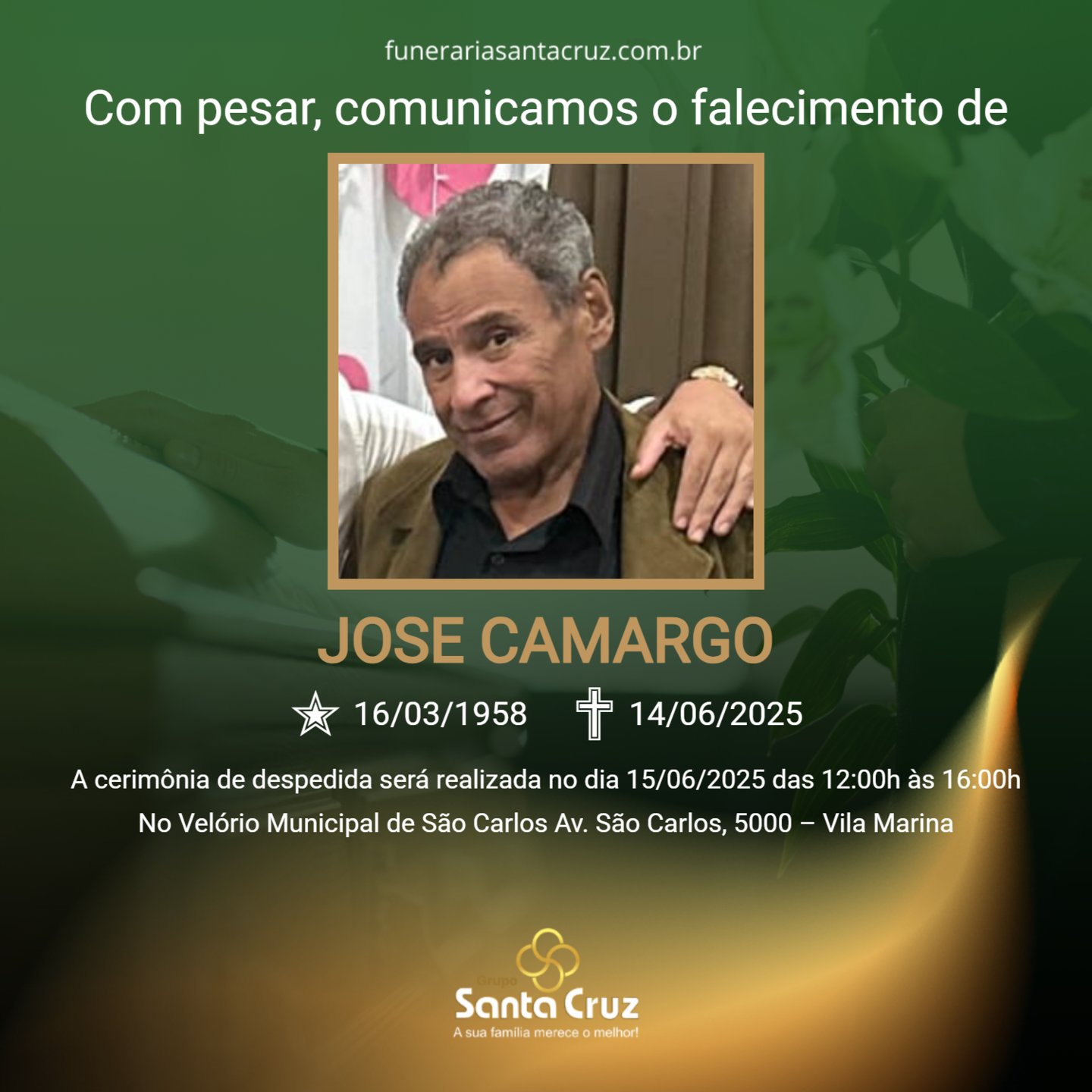 É com grande pesar que o Grupo Santa Cruz informa o falecimento do Sr. Jose Camargo, aos 67 anos de idade, ocorrido no dia 14/06/2025, na cidade de São Carlos.