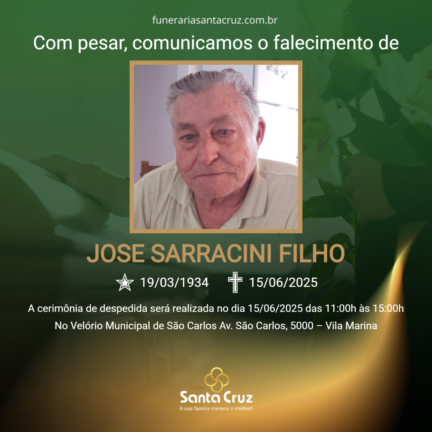 É com grande pesar que o Grupo Santa Cruz informa o falecimento do Sr. Jose Sarracini Filho, aos 91 anos de idade, ocorrido no dia 15/06/2025, na cidade de São Carlos.