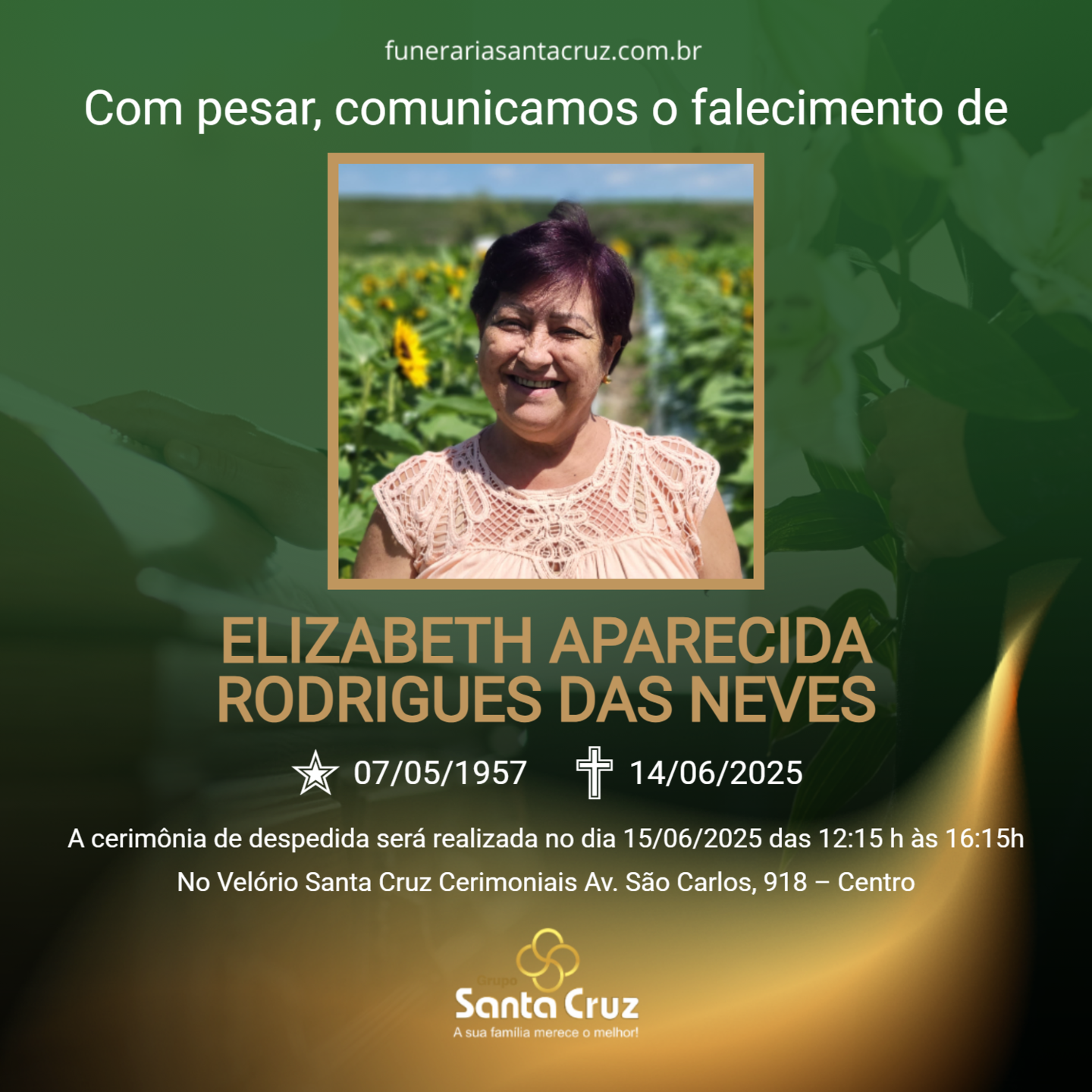 É com grande pesar que o Grupo Santa Cruz informa o falecimento da Sra. Elizabeth Aparecida Rodrigues das Neves, aos 68 anos de idade, ocorrido no dia 14/06/2025, na cidade de São Carlos.