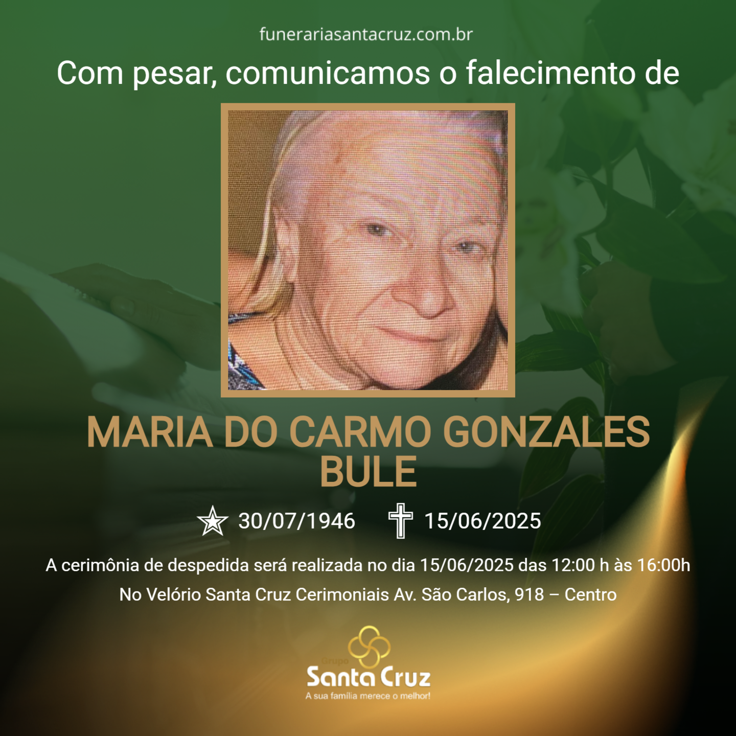 É com grande pesar que o Grupo Santa Cruz informa o falecimento da Sra. Maria do Carmo Gonzales Bule, aos 78 anos de idade, ocorrido no dia 15/06/2025, na cidade de São Carlos.