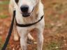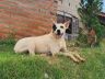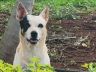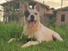 Ele tem porte médio, é castrado, tem pêlo branco, rostinho pirata e sem rabo. Não está usando coleira.