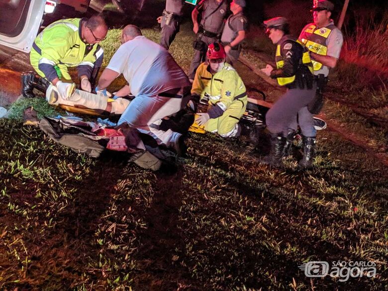 Moto que o policial conduzia - Crédito: Maycon Maximino/São Carlos AgoraUm policial militar de 46 anos, que trabalha em São Carlos, ficou gravemente ferido em um acidente de trânsito na noite desta quarta-feira (15), na rodovia Engenheiro Thales de Lorena Peixoto Jr. (SP-318), na região do Varjão. Ele conduzia uma moto e atropelou um pedestre que tentava atravessar a pista.