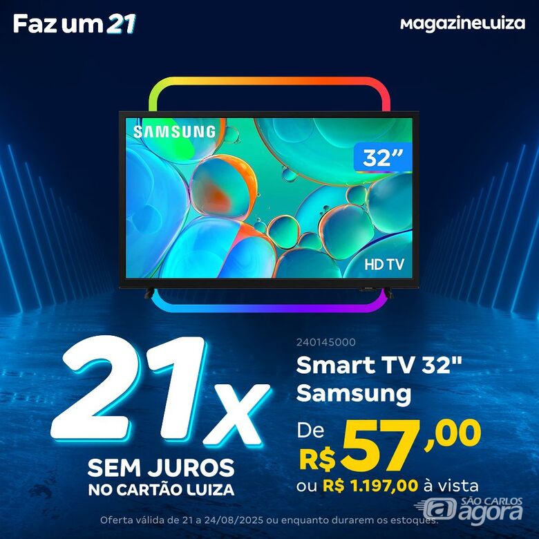 - Smart TV 32” Samsung: Apenas 21X de R$ 57,00 no Cartão Luiza.