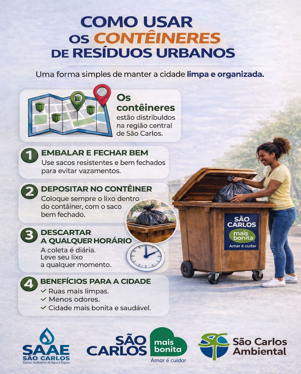 A Prefeitura de São Carlos, por meio do Serviço Autônomo de Água e Esgoto de São Carlos, reforça a importância do uso correto dos contêineres de resíduos urbanos distribuídos na região central da cidade. A iniciativa busca incentivar a população a adotar práticas simples no descarte do lixo, contribuindo para ruas mais limpas, redução de odores e melhoria da qualidade de vida.