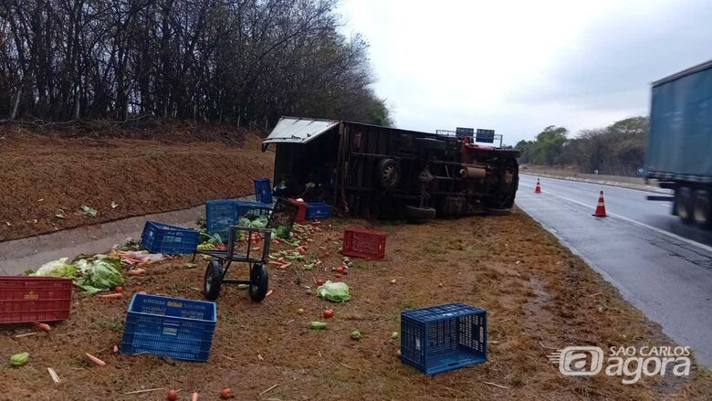 Pouco depois, outro caminhão, carregado com verduras, também perdeu o controle na mesma altura da rodovia. O veículo rodou na pista, saiu para o canteiro lateral e acabou tombando. Assim como no primeiro caso, os dois ocupantes não se feriram.