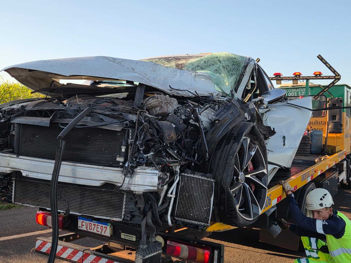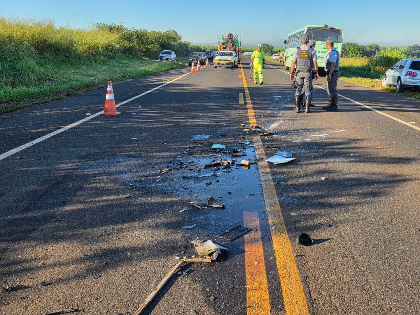 Com impacto da batida, tanto o carro que ficou completamente destruído como o ônibus ficaram atravessados entre as duas faixas da rodovia. O motorista do Audi sofreu ferimentos moderados e precisou ser socorrido, pelo Samu para o Hospital José Nigro Neto em Américo.