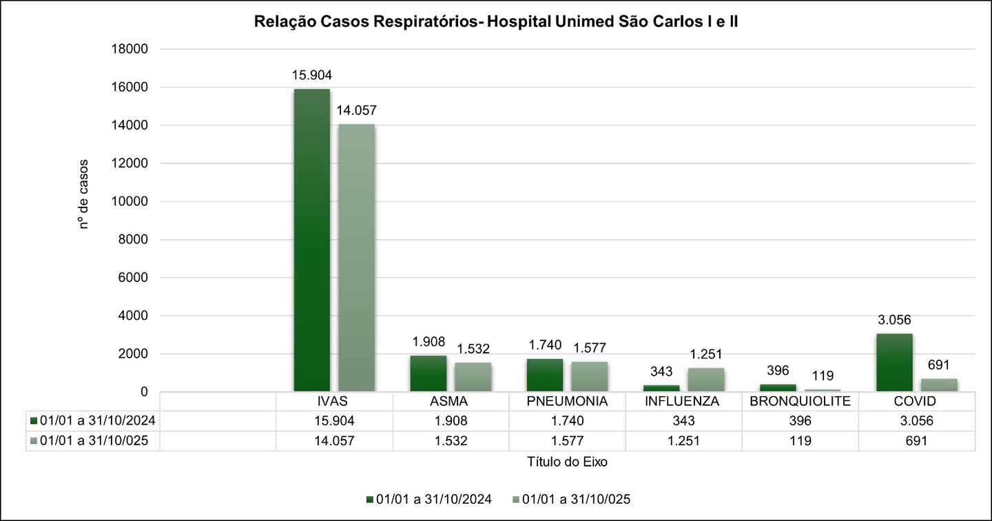 Os casos de bronquiolite igualmente apresentaram redução. Entre janeiro e outubro de 2024, a UNIMED São Carlos contabilizou 396 casos; já nos dez primeiros meses de 2025, foram 119.